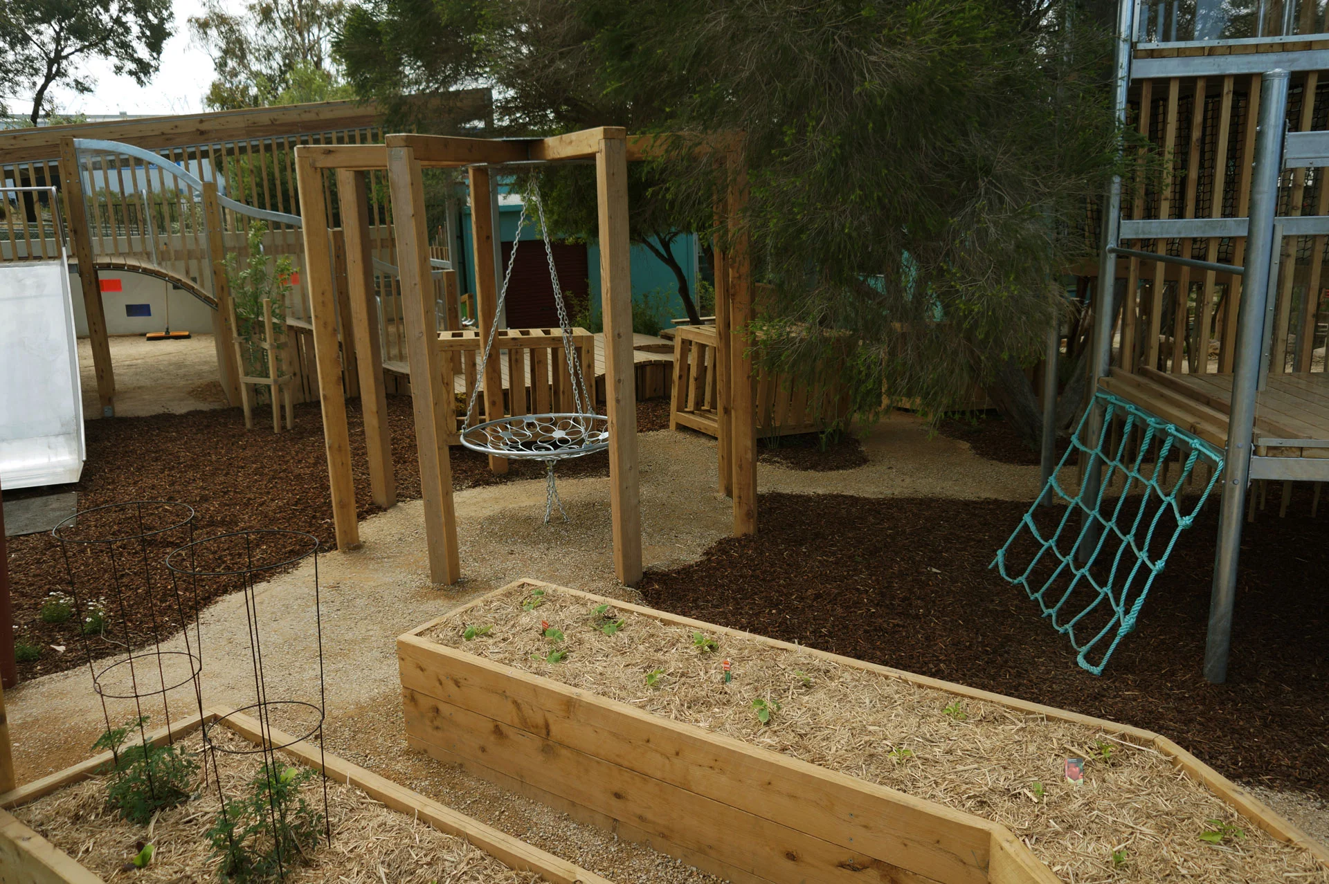 Using natural elements in play design help create diverse spaces that change with time - vegetation grows, it flowers, it changes shape constantly and regenerates new play spaces; rocks and logs provide unique forms and habitats for small animals; sticks and general bush refuse provide endless building and play opportunities; rocks and boulders can become anything with a pinch of imagination. Blended with a variety of elements that work together and you have spaces that evolve and that children can observe, experience and contribute to the changing environment around them.